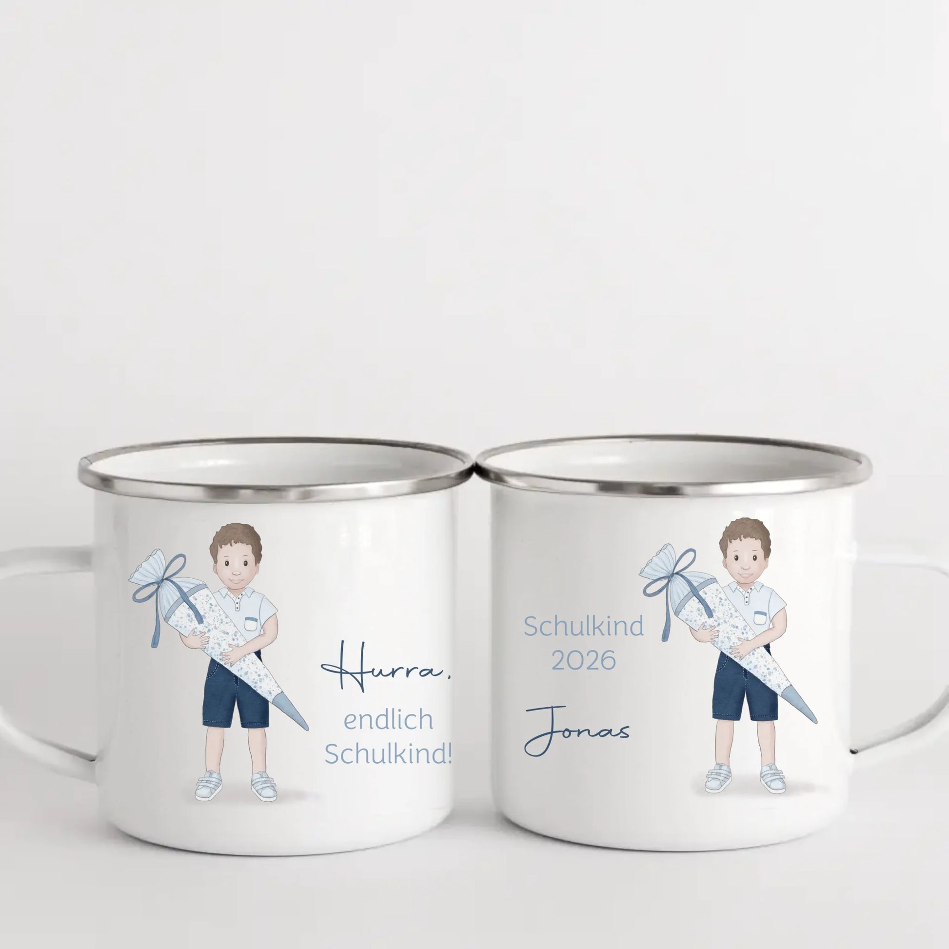Kindertasse zur Einschulung, Junge mit Zuckertüte